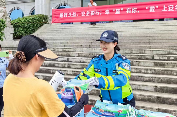 7月10日,花垣县公安局交通管理大队组织开展“戴好头盔,安全骑行”送头盔讲法规宣传活动,守护市民安全出行。(花垣县融媒体中心供图)