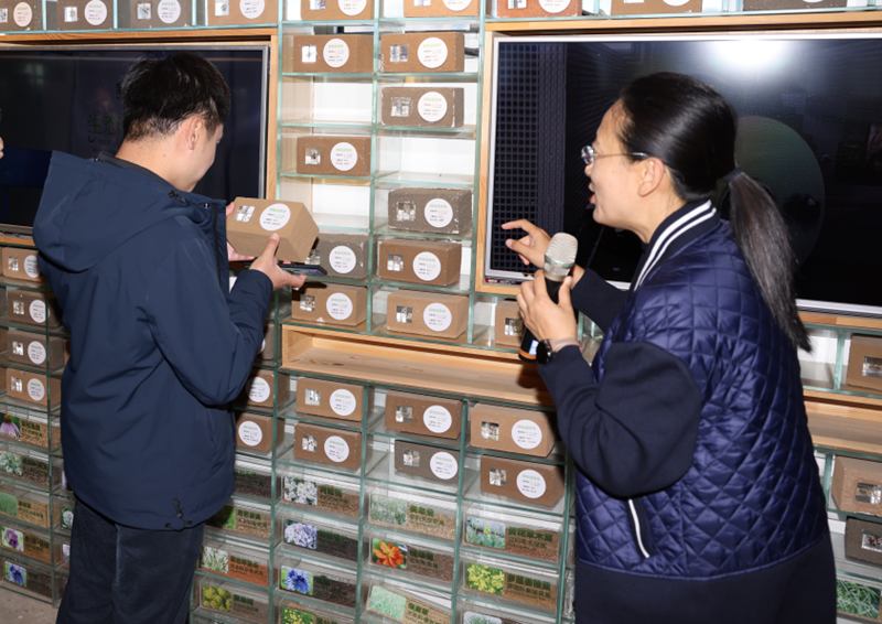 10月19日,“文明中国”主题采访报道组在蒙草种业中心参观调研,这是讲解员在向记者介绍“生态体检中心”收集到的土壤。蒙草种业中心是全国18个种业研究中心、科研基地之一,积极履行企业责任,宣传生态文明思想,获得了呼和浩特市首批铸牢中华民族共同体意识教育实践基地称号。(地方媒体供图)