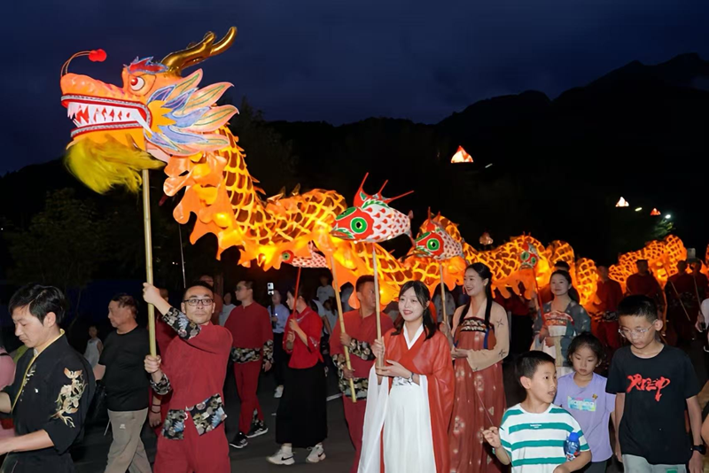 在天堂寨镇,“化鱼成龙”夜游将“非遗”舞龙、传统鱼灯与现代光影结合,营造出如梦似幻的“山水剧场”。游客可手提鱼灯加入巡游队伍,亦可在祈福区留下心愿。一场原本静态的观赏,变成了可走进、可触摸的文化旅程。