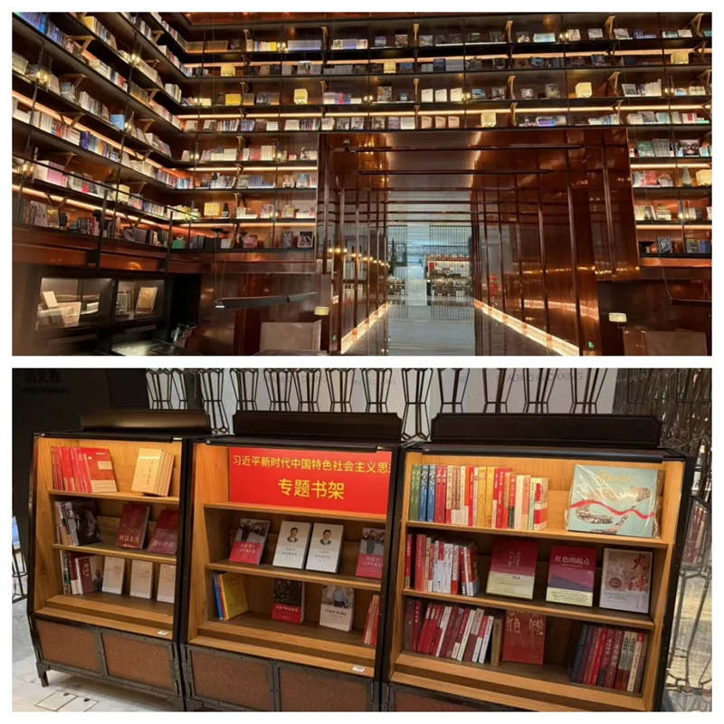 上图:位于大兴机场的掇集书店;下图:书店内的专题书架。张爽 摄