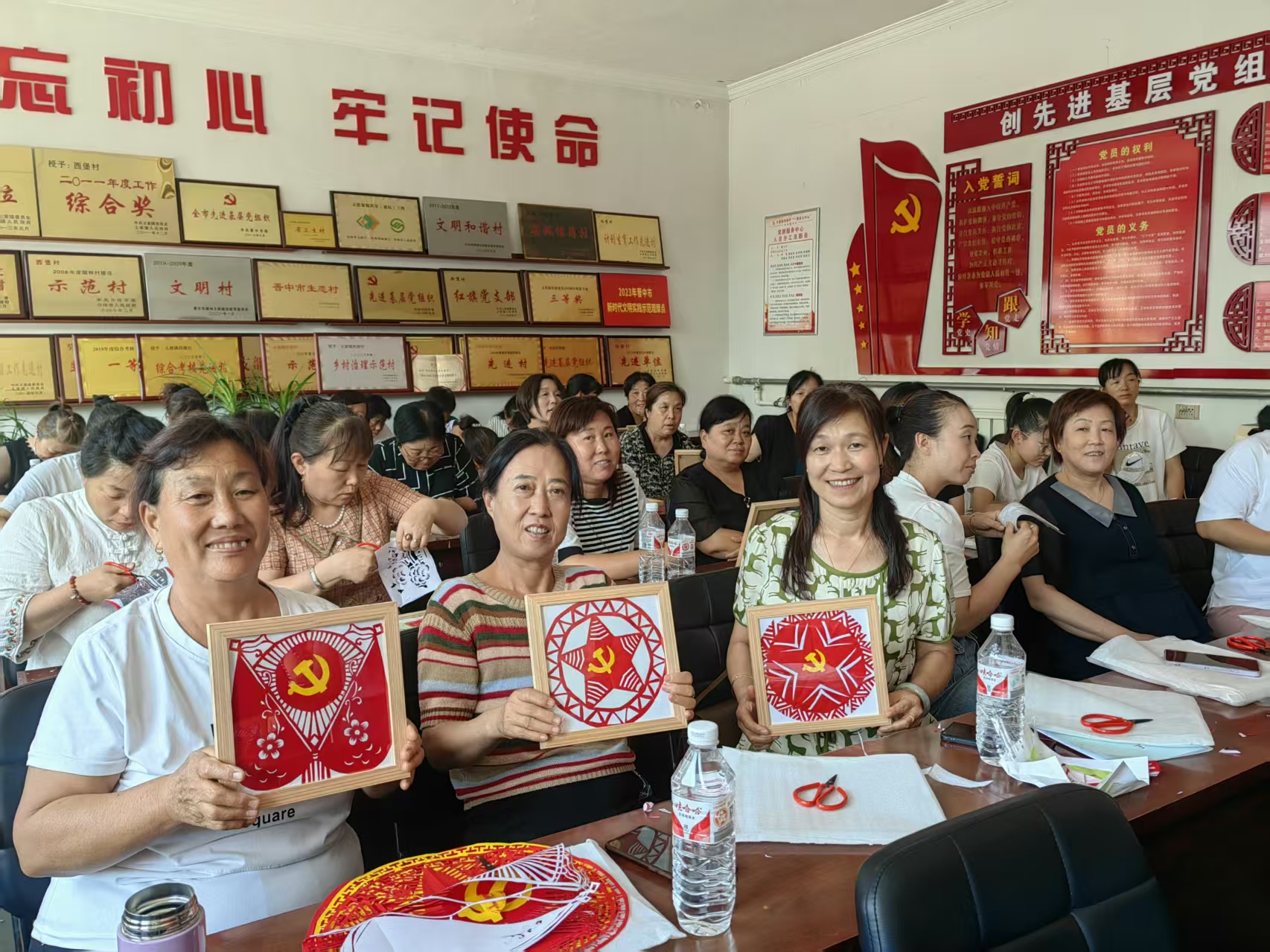 西堡村村民围在一起剪纸,丰富日常生活。