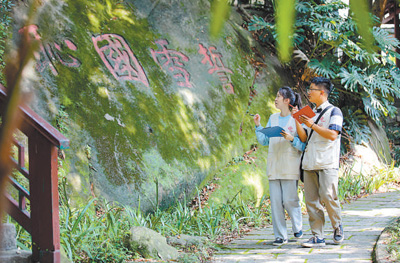 二〇二四年四月十五日,福建省福州市鼓楼区于山社区,文物普查员正在登记一处石刻。谢贵明摄(人民视觉)