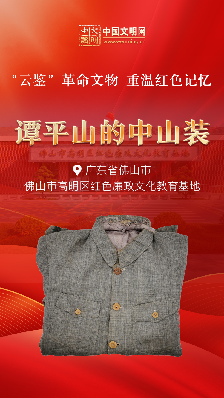 革命文物,承载党和人民英勇奋斗的光荣历史,是弘扬革命传统和革命文化、加强社会主义精神文明建设、激发爱国热情、振奋民族精神的生动教材。中国文明网“文明之声·云鉴馆藏”专栏邀您走进各地革命博物馆、纪念馆、党史馆等红色主题场馆,一起“打卡”红色地标,“云鉴”红色馆藏,汲取奋进力量。今天为您介绍佛山市高明区红色廉政文化教育基地的馆藏文物——谭平山的中山装。